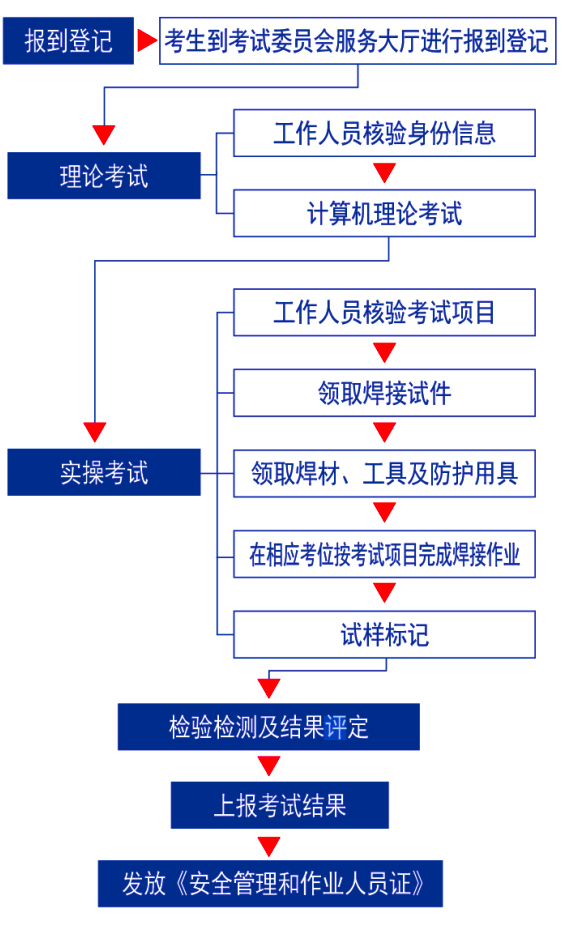 焊工考試委員會設有:實操考試基地、多功能理論考試教室、焊材庫、試樣庫監控室、無損檢測室、理化實驗室等,建筑面積達700余平方米。
